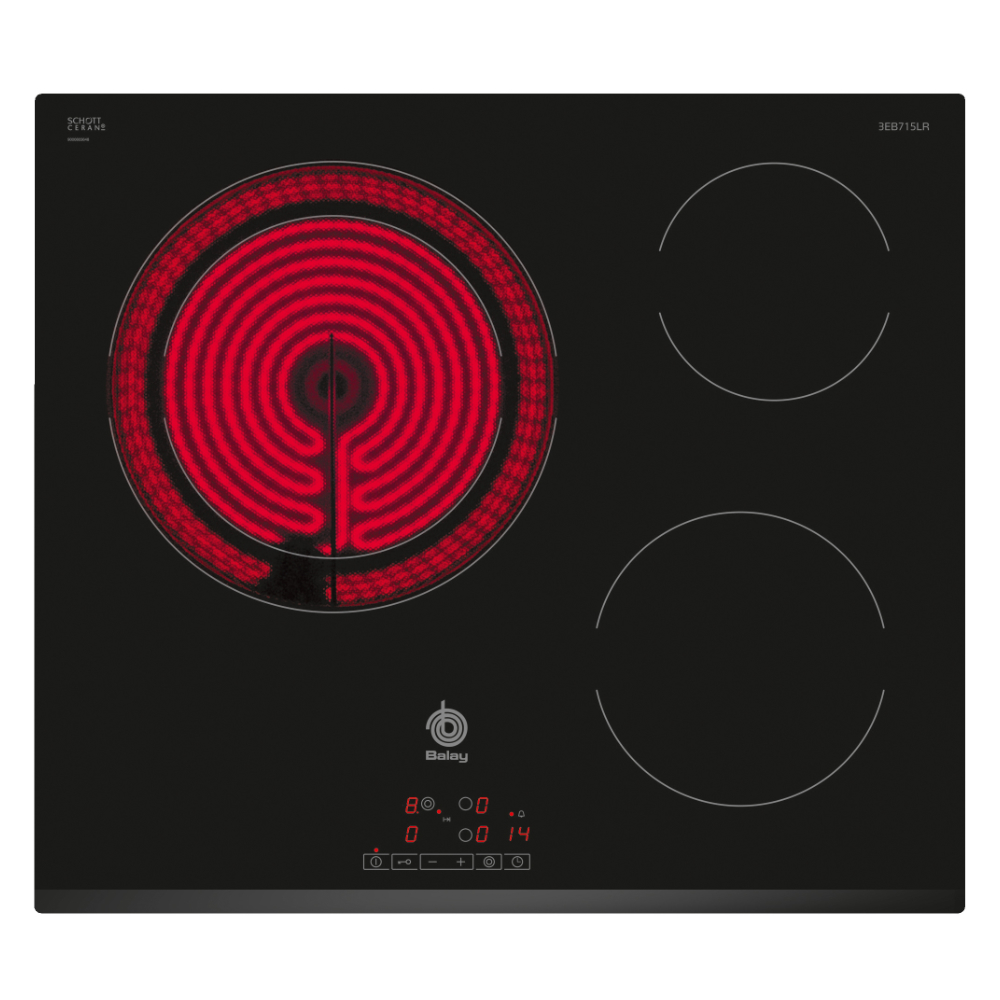 Por ejemplo, en nuestra tienda puedes encontrar la vitrocerámica Balay 3EB715LR que es un modelo integrable biselado negro con 3 zonas de cocción, incluyendo una zona gigante que tiene una medida de vitrocerámica de 28 cm. Ofrece una potencia total de 5700 W, incorpora función memoria, programador de tiempo, y sistema de seguridad por autodesconexión antiolvido.